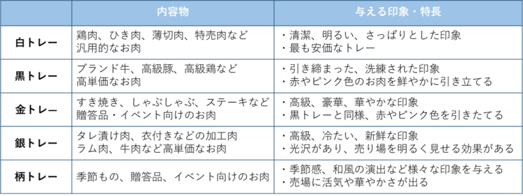 精肉用トレーと言えば、白や銀、柄付きのものを想像される方が多いと思います。