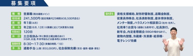 2027年新卒採用の募集要項です。生産管理職の場合は、初任給の固定残業代を省いた金額となります。