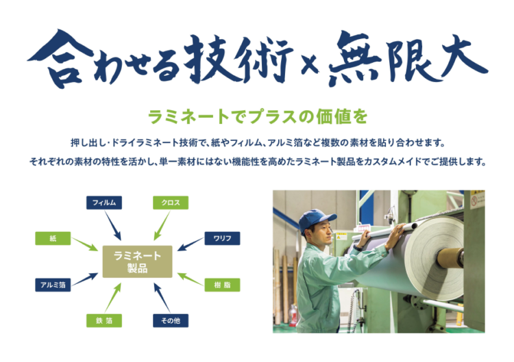 押し出し・ドライラミネート技術で、紙やフィルム、アルミ箔など複数の素材を貼り合わせます。